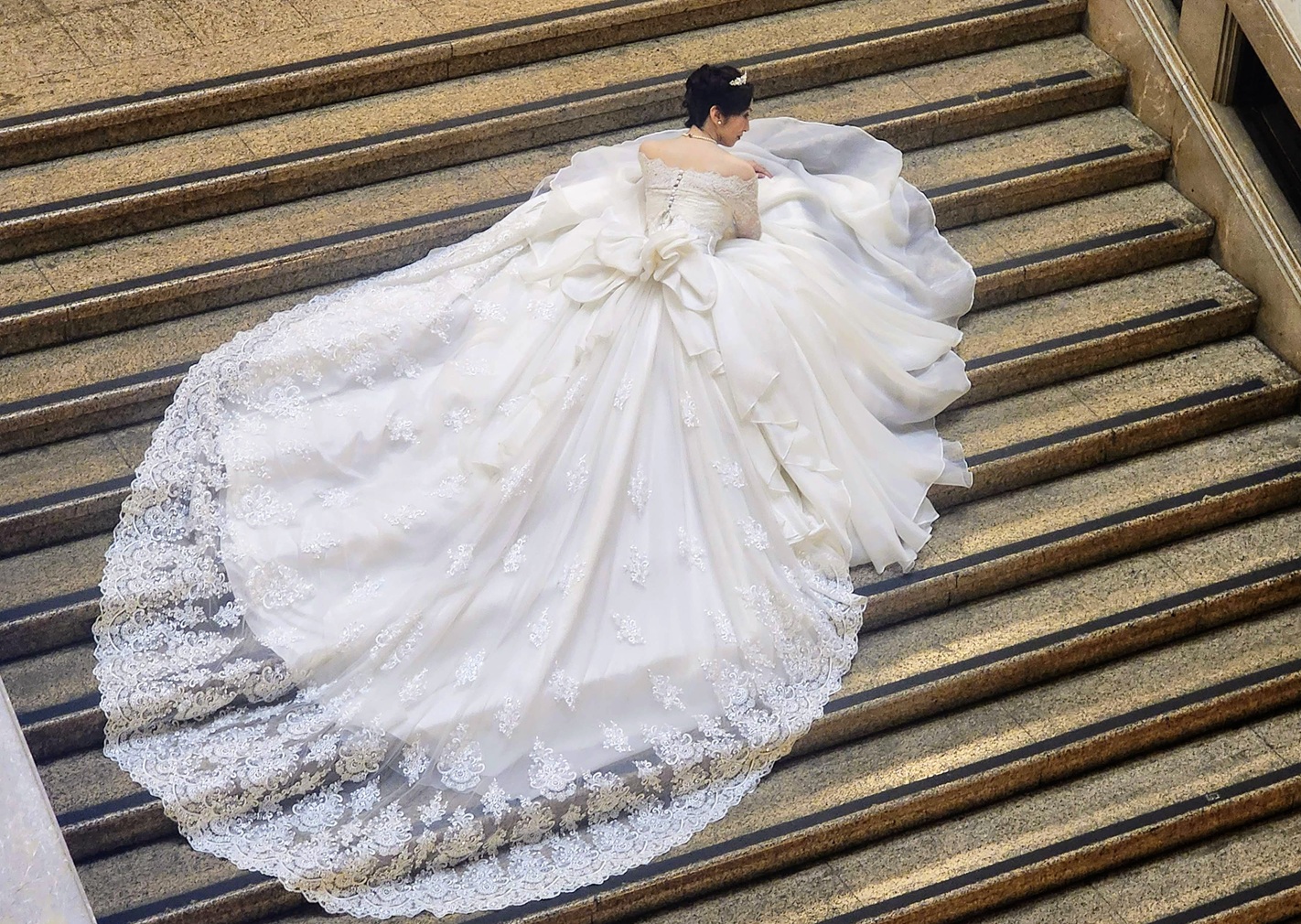 ③ ドレスは定価の75%オフでご案内いたします。東京国立博物館にふさわしいロングトレーンなどたくさんの中からお選びください。